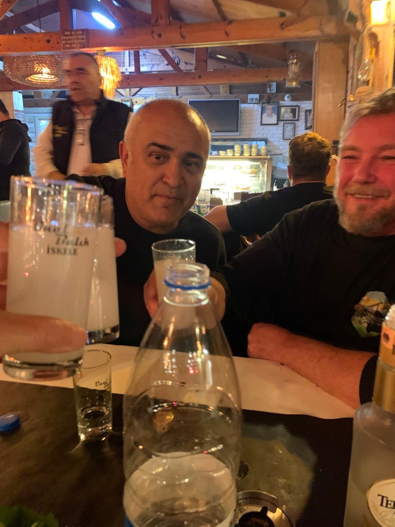 Dopo una mezz’ora tra un antipasto e un bicchiere di Raki, capiamo l’allegria che pervade l’ambiente , la cena e’ ottima , e i Brindisi tanti, veniamo poi invitati nel gruppo del professore , qui parlano tutti molto bene l’inglese e qualcuno anche il tedesco. Ci arriva ancora frutta , raki , la torta , raki , cantiamo , raki, balliamo , raki , facciamo le foto ci scambiamo i numeri di telefono e barcollando ritorniamo al furgone .
