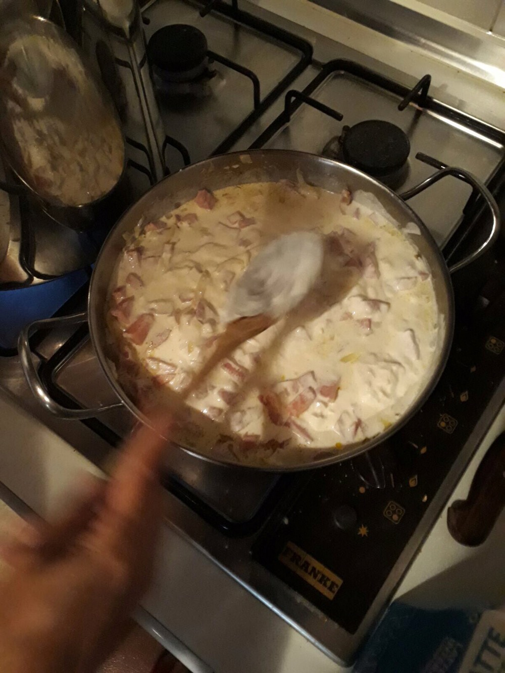 Schneide den Schinken in Quadrate. Warm in der Pfanne und füge die Sahne hinzu.