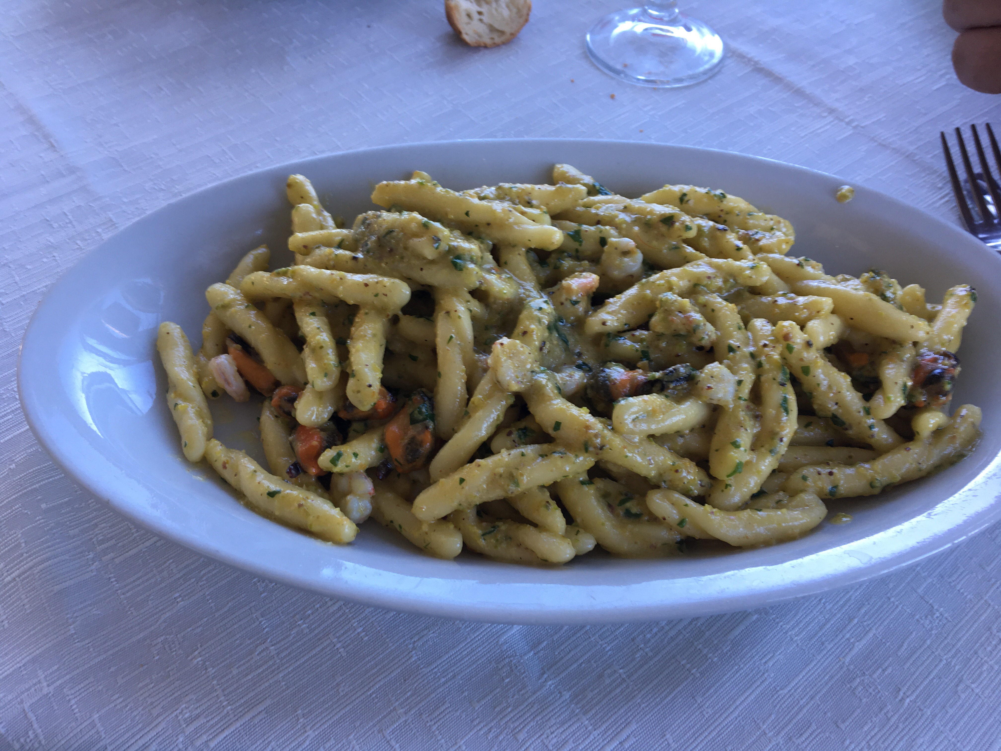 O gli strozzapretti con un pesto di pistacchio di Bronte e i frutti di mare …..