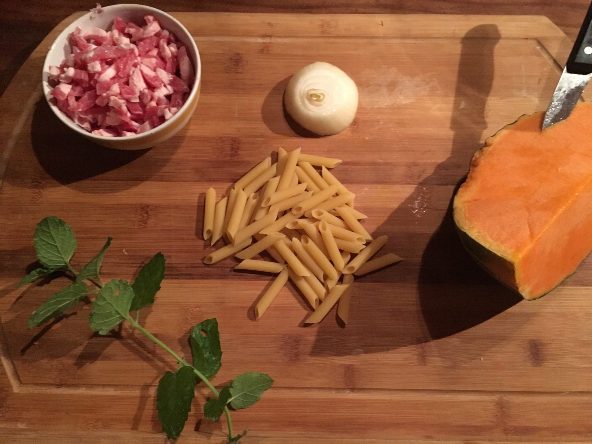 Pennette zucca pancetta e menta ….per fortuna il riso era finito